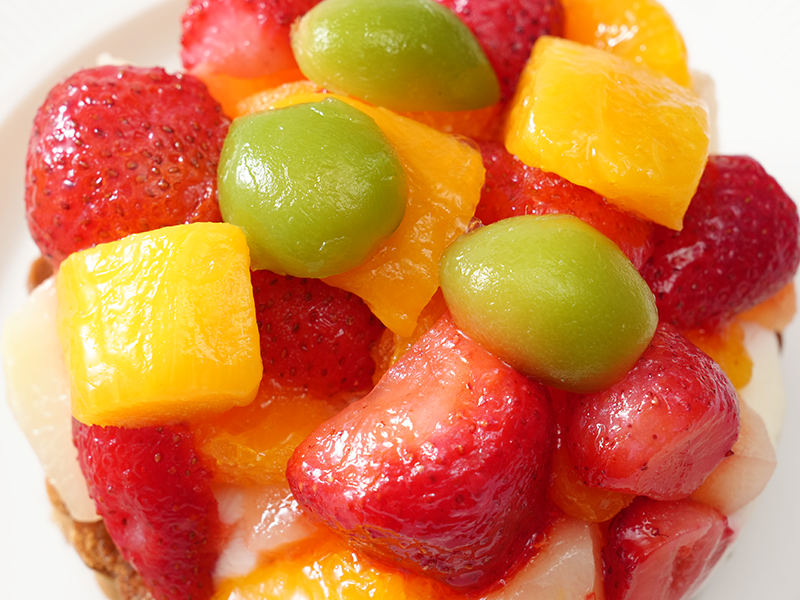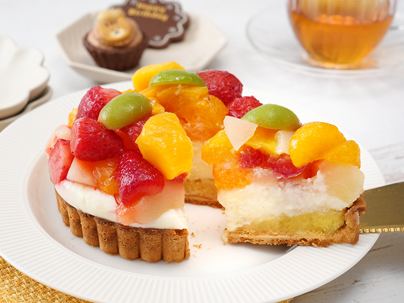 5種の完熟フルーツ(洋梨、みかん、マンゴー、若桃、いちご)を惜しみなく使用し、華やかで贅沢なタルトに仕上げました。